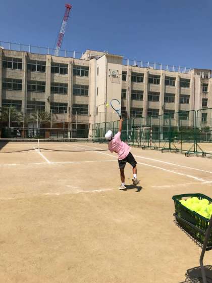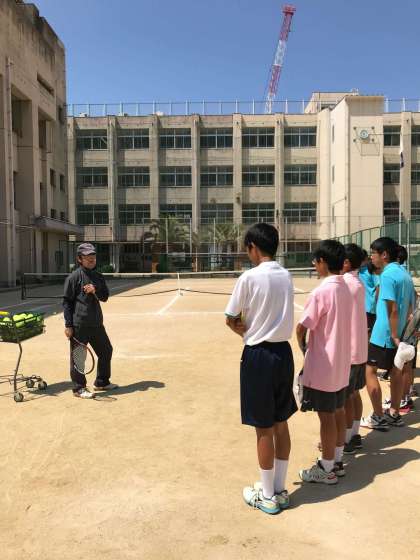 男子テニス部は本日午前中、大淀中学校にて練習会に参加し、グランドストロークとサービスのご指導をいただきました。