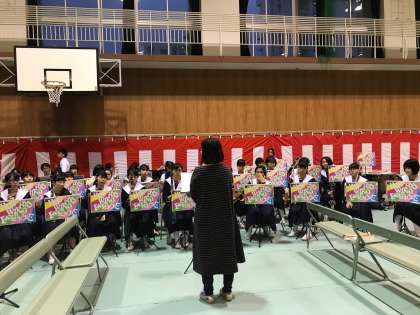 吹奏楽部、明日の式典のためのリハーサルの様子です。