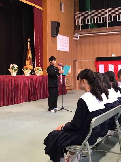在校生を代表して、本校生徒会長より、「生徒よろこびの言葉」です。