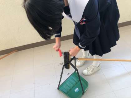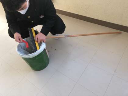 美化委員会では、教室のほうきを長く良い状態で使うために、毛かきを使ってごみ取りをしました。