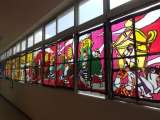 1年生の共同作品は、「ステンドグラス 天神祭」です。 ケント紙を切り抜いて色セロ...