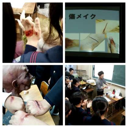 TVや映画の大道具・小道具の制作経験がある専門学校の先生が、映像や実物を使いながら体験指導。生徒は実際に自分の手に傷メイクし、痛々しい傷をつくりました。