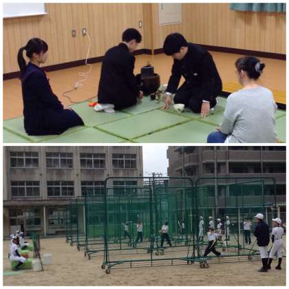 部活動体験2日目。運動場では野球部が、多目的室では茶道部が活動していました。この2つ以外の部活動にもたくさんの1年生が、それぞれの部で体験しました。体験入部は明日12日(金)と16日(火)、部活動編成は17日(水)です。