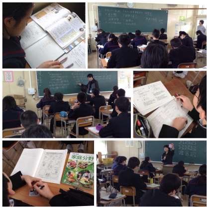 3年生の各クラスの授業です。社会では2年生の歴史の学習の続きを、数学では振り返りプリントを活用して2年生までの学習の復習を、家庭科では校区の幼稚園で行う保育実習で利活用するフェルトのおもちゃ作りについて、それぞれに落ち着いて授業が進められています。(写真上から1組社会、2組数学、3組家庭科です。)