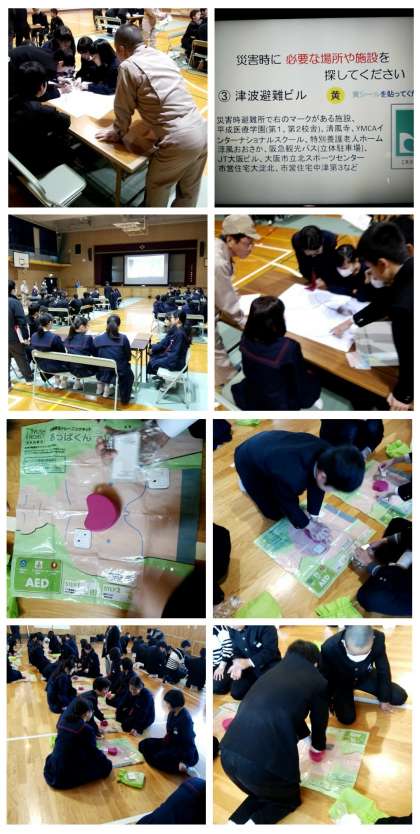 2年生は災害図上訓練(DIG)を体育館でしました。地域防災リーダー・北区役所・大阪市危機管理室にご協力いただいて、自分たちが住む地域の防災上の強みと弱みを分析しました。