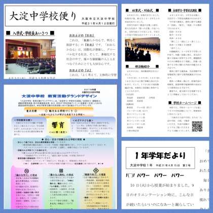 学校から配布しているプリントの中から、「大淀中学校だより(4月12日発行)」や各学年の学年だより、「保健だより」、「食育つうしん」などを、また、今年度、改訂した「大淀中学校グランドデザイン」もホームページに掲示しています。