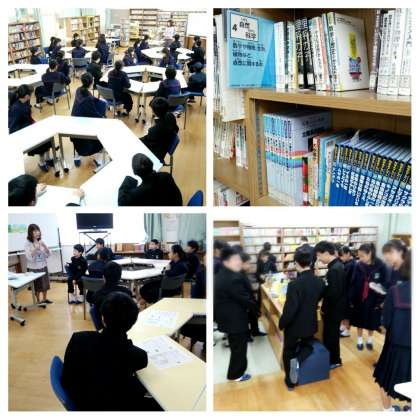本校の図書館は昨年度にリノベーションしています。1年生は、新しい図書館にたくさんの本が入っているのを喜んでいました。本に親しむ機会を増やすために、「図書館クイズ」「図書フェスタ」「図書館外に新刊書の展示」などをしています。図書館を積極的に利用してほしいと思います。