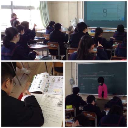 1年生の各教室では、教科書やプロジェクターを使った授業が進められています。英語ではアルファベットの学習、数学では正の数・負の数、理科では顕微鏡などの使い方など。教科ごとに先生が入れ替わる中学校の授業にも少しずつ慣れてきているようです。