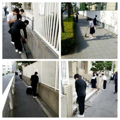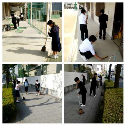 今年度初めての早朝清掃です。早朝清掃は朝の時間帯に当番が学校内外を清掃する活動です。いつもより少し早く登校して、掃き掃除などをしています。昨日は放課後に、美化委員が今朝の準備をしました。