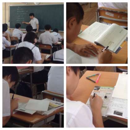 5月18日は、土曜授業を行います。1・2時間目は、1・3年生は授業、2年生は学びTAIの取組を行いますので、お子様のクラス以外もご参観ください。その後、進路説明会、部活動保護者懇談会を行います。ご来校の際は、保護者証の携行をお願いします。写真は、1年生の体育(男子)と3年生の国語、数学、社会の授業の様子です。