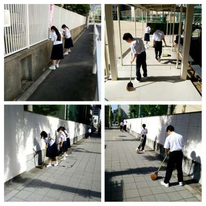 生徒たちは掃除をしながら、通行人にもあいさつをしています。さわやかな雰囲気が広がっています。
