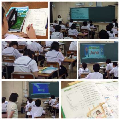1学期の折り返しを迎えた教室では、パソコンやプロジェクターなどのICT機器を効果的に使い、主たる教材の教科書と手作りプリントを使用して、英語の授業が進められています。小学校から英語の学習を重ねてきた1年生。生徒たちは、主体的で対話的な深い学びをめざして一生懸命取り組んでいます。