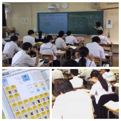 3年生の教室での理科の授業では、イオンについての学習をしています。パソコンやプロジェクターなどのICT機器を効果的に活用しつつ、教科書と手作りプリントを使っての授業。後半は、塩化銅の電気分解の学習。明日は、理科室で実験を行います。