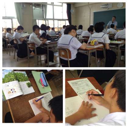 1年生の理科の授業では、「栄養分をつくるしくみ」の学習を進めています。次回は、理科室での「光合成にともなう二酸化炭素の出入り」の実験。実験の結果を予想しつつ、条件を1つだけ変えることで、、条件がどれかを確かめる対照実験を行います。ただ単に実験をするのではなく、学習を深めるために、生徒たちは先生の発問に一生懸命考えて、答えていました。また、ノートの書き方や活用の仕方についても、あらためて説明がありました。