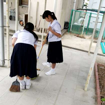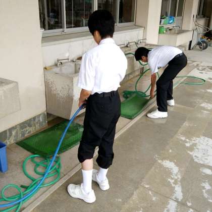 1年生が、毎週、砂落としマットを水洗いして砂を取り除いているので、校舎に砂があまり上がりません。毎週の早朝清掃と日々の清掃で、きれいな校舎が保たれています。