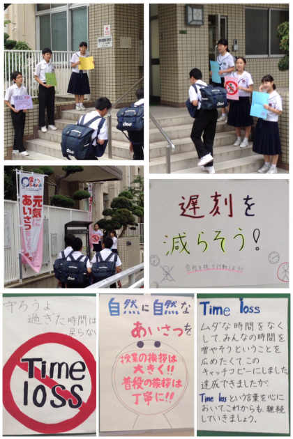 1学期も折り返し。生徒会役員の皆さんが、挨拶運動の際に持っているのは「遅刻を減らそう(五分前行動)」を呼びかけるポスター。