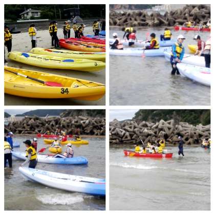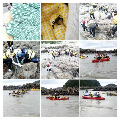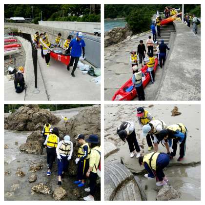 風があって波が高いので、テトラポットの内側の波のおだやかなところで、カヌー・カヤックをしました。声を掛け合ってハドルをこいでいます。磯観察ではいろいろな生き物を見たり、手に取ったりすることができました。