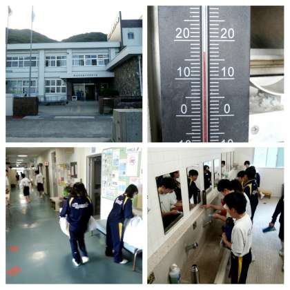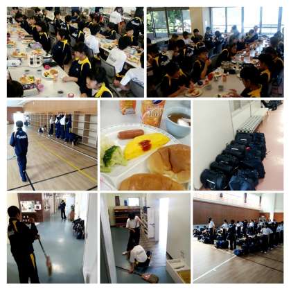 朝食を済ませて、清掃活動。「来たときよりも美しく」の実践です。「5分前行動」も意識してできているようです。