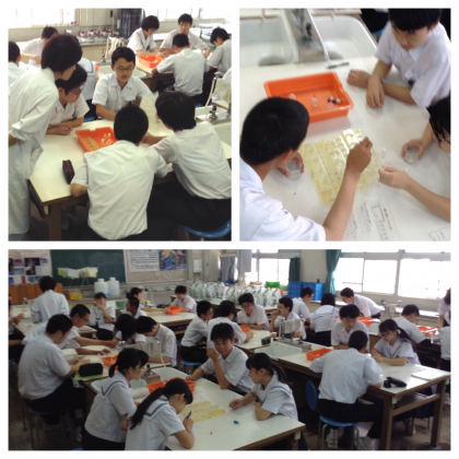 3年生の理科の授業が、理科室で行われていました。実験のテーマは「酸性やアルカリ性の性質を調べよう」。黒板には、「HCl」や「酢酸」など6種類の物質の表記。流石は3年生。先生の指示をよく守り、手馴れた様子で実験を進めていました。