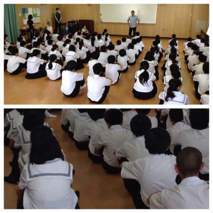 1年生が登校して全学年が揃っての朝を迎えました。1年生の集会では、一泊移住の成果と課題を一人ひとりが意識して行動することの大切さについての話がありました。