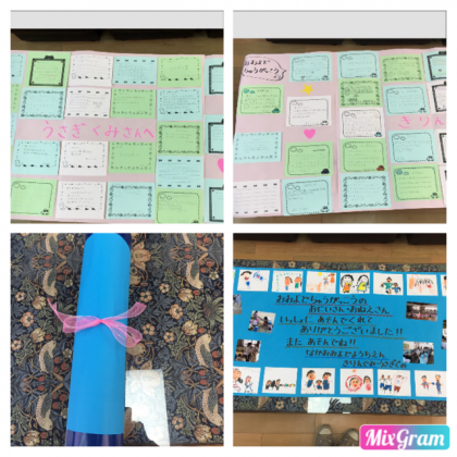 先日、3年生は保育実習で園児たちとふれあいました。生徒が書いたお礼のお手紙を届けました(写真上)。すると、園児からも心のこもった素敵な絵のプレゼントがありました(写真下)。