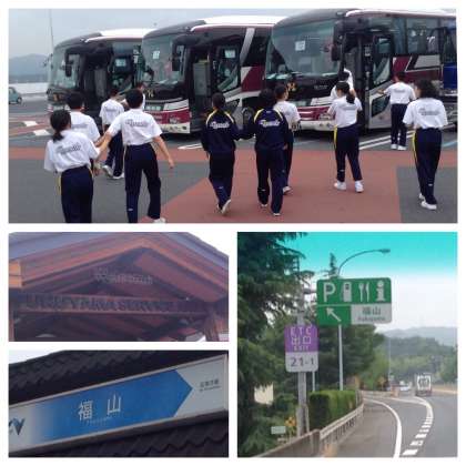 広島県に入りました。福山SAでのトイレ休憩。生徒たちはSAでもとても行儀よく、休憩中の一般のドライバーさんからお褒めの言葉をいただきました。