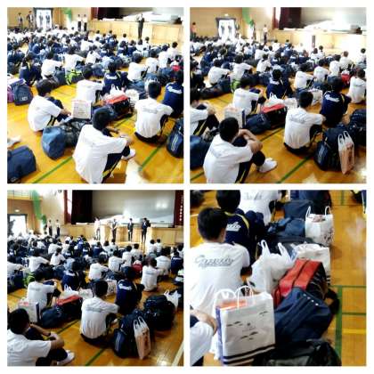 解散式を体育館で行いました。バスを降りた後、たくさんのお土産をもって体育館に整列しました。