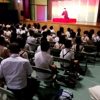 中津小学校・大淀小学校の6年生を招いて、本校1年生と合同で芸術鑑賞会をしました。公演中に寄席囃子教室もあり、児童・生徒は落語を十分に楽しむことができました。