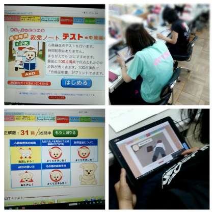 タブレット端末を使って、応急手当の研修をしました。パソコンやスマートフォンで応急手当講習を体験できるように大阪市が開発したアプリです。初級編・中級編・上級編のクイズに答えながら、救急時の対応について学びました。
