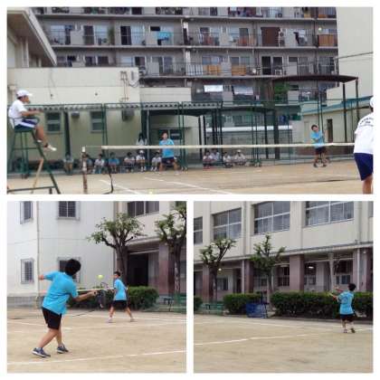 天候が心配されましたが、テニス部は団体戦の1回戦に挑んでいます。会場は鶴見区の中学校、対戦相手は豊中の学校です。団体戦は、ダブルス2ペアと3人のシングルスで戦い、3勝した学校が勝ち進みます。応援にも熱が入ります。