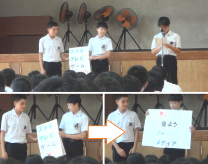 全校集会にて、本日から3日間の「ノーメディアデー」が始まることのお知らせがありました。保健委員会の生徒が持っているポスターが、なんと「スマホ テレビ ゲーム NO」から「早く 寝よう ノーメディア」に早変わりしました。