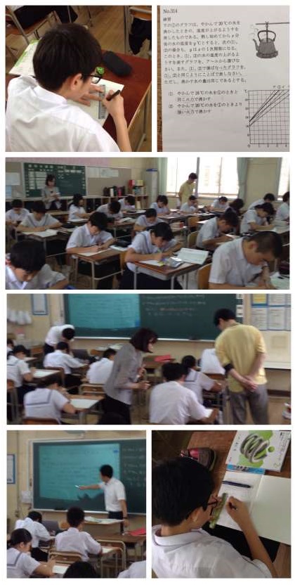 先生方は、生徒たちにより良い授業を提供できるよう、日々、授業改善に向けて研さんを積んでいます。また、授業では、ワークシートを用意し、ICT機器を活用し、具体物を提示するなど、それぞれに工夫した授業を進めています。ワークシートには「・・・ことばで表しなさい。」との問いがあるなど、新しい学力観に基づいた授業が展開されています。