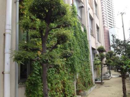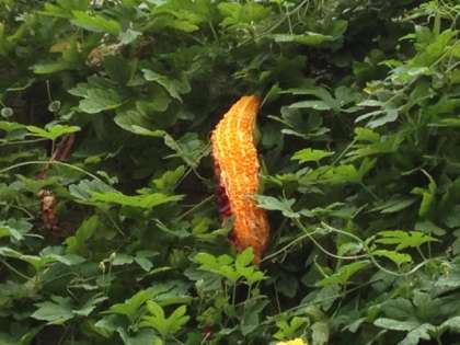10月1日(水)、暑い夏の日差しを遮ってくれたみどりのカーテンの現在の様子です。ゴーヤの実がオレンジ色にかわり、真っ赤な種をつけています。