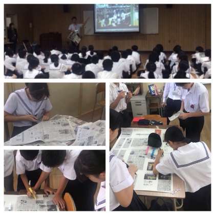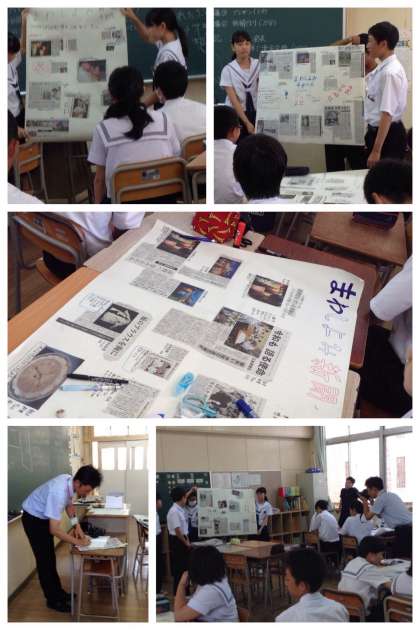 2年生の登校日。まずは、学年全体で、8月6日に広島に取材に行かれていた記者の方から当日の様子をお聴きしました。その後は、クラスに分かれてのワークショップ「まわし読み新聞」。朝日新聞社からお越しいただいたファシリテーターの方にうまくリードしていただき、班に1枚の新聞を作成し発表、その後、振返りで編集後記の作成に取り組みました。