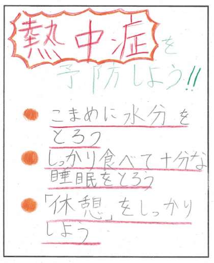 保健委員からのメッセージも残り少なくなってきました。今週は「熱中症を予防しよう」です。夏バテ気味の人は、しっかり食べて、十分な睡眠をとってください。