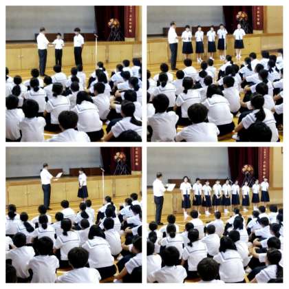 少林寺拳法部、剣道部、テニス部、バドミントン部、水泳部、合唱部の表彰を行いました。おめでとうございます。