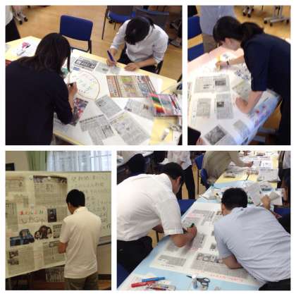 国語部では、第1部としてワークショップ「まわし読み新聞」の作成。講師のファシリテーターの方の巧妙な進行で研修が進んでいます。