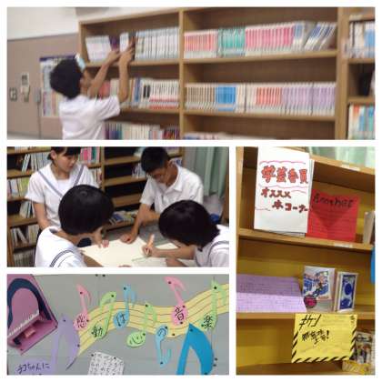 昼休みの図書館では、学芸委員の生徒が、本の整理や貸出、利用者の集計をしています。そして、入り口には図書館支援員の先生のオブジェ!!