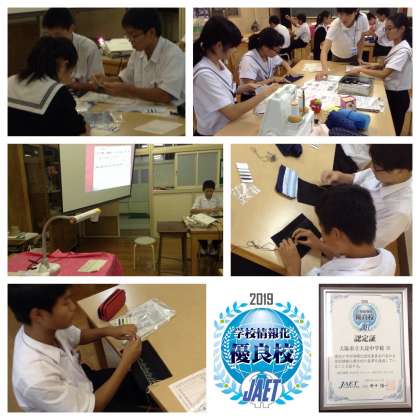 家庭分野の授業では、刺繍(ししゅう)などの実習。ICT機器(実物投影機)を使って、手元の作業をスクリーンに映すなど、工夫を凝らして授業を進めています。