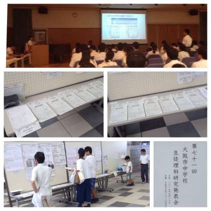 第71回大阪市中学校生徒理科研究発表会が、咲くやこの花中学校で行われました。本校からは、作品展示の部に13作品を出品しました。また、会場では、プレゼンテーションの部も行われ、各校の生徒たちの一生懸命な発表と、参加者との質疑応答が熱く行われていました。