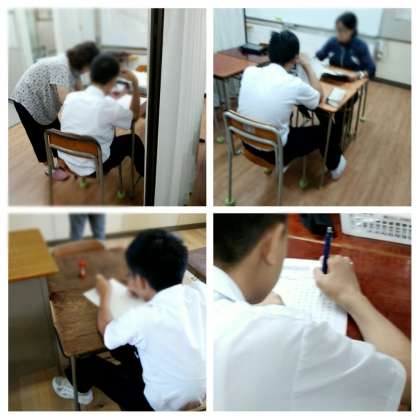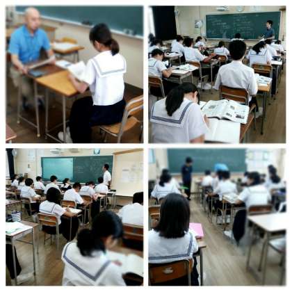 午後から体育大会の全体練習があります。午前は、月曜日の時間割で授業を行っています。上の写真は2年生の英語・数学・社会の授業のようすです。英語はC-NETの先生に直接指導してもらっています。下の写真はサポートルームでの授業のようすです。