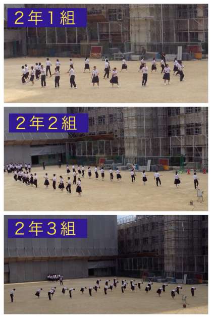 秋空のもと、体育大会で行う応援合戦の練習をしました。運動場では、今日は2年生が本番さながらに、時間を計っての練習。体育大会は、来週金曜日(9月27日)に開催されます。