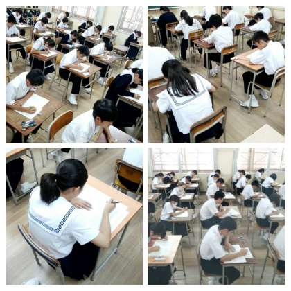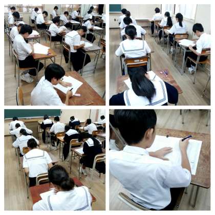 今日と明日は中間テスト。社会、国語、数学のテストを行いました。テストに向けて励んできた学習の成果を出せるよう、真剣な表情で受験していました。(写真上1年生、写真下2年生)