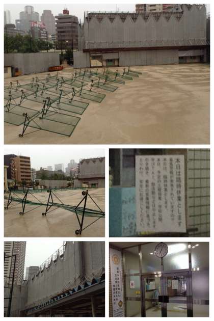 台風の接近により暴風警報が発表されましたので、本日は臨時休業になりました。学校では、臨時休業をお知らせするプリントを玄関に掲示し、防球ネットを倒すなど台風に備えています。また、工事についても、校舎を覆っているネットを一部外して、暴風に備えています。