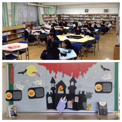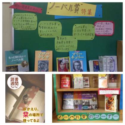 読書週間【10/27(日)〜11/9(土)】を迎える図書館は、ラーニングコモンズとしても活用しています(写真上)。また、図書館支援員の先生が、入口の飾りつけを立体的にしたり、ノーベル賞コーナーを設けたり、様々に工夫しています。