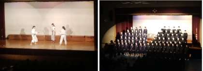 午後の部は、少林寺拳法部「演武」、2年生「学年合唱」、3年生「学年合唱と映像」の舞台発表をしました。午前も含めて会場は歌声と拍手が響き渡りました。