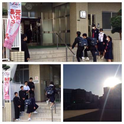雲ひとつない秋空のもと、冷え込みが厳しい朝を迎えました。マスクをしている姿が心配される後期生徒会役員。それでも、早めに登校して、「元気にあいさつをしよう」ののぼりを立ててあいさつ運動に取り組んでいます。