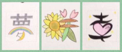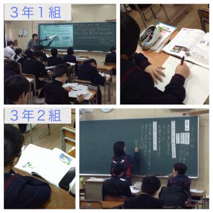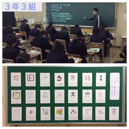 3年生が、教室で落ち着いて授業を受けています。写真上から1組英語、2組道徳、3組美術。美術室の前には、「夢」「咲」「幸」など「3年間を振り返って自分を表す一文字」の作品が展示されています。