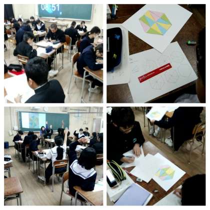 三角形の色画用紙を使って、2人ペアでしきつめ模様を考えました。しきつめ模様をつくる活動を通して、そこに含まれる合同な図形の位置関係に着目し、図形の移動について学びました。