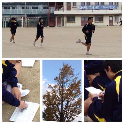 今日の最高気温は13度と冬本番の寒さ。3年生の体育の授業は長距離走。久しぶりに長距離を走る生徒も多いようで、部活動をしていた頃のスピードが出なく歯がゆい思いをしている生徒もいたことでしょう。生徒たちは、挫(くじ)けそうな自分の気持ちと向き合い、仲間とともにしっかりと走り切ります。